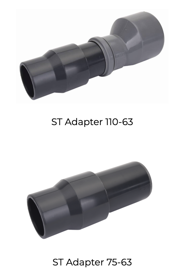 Die SUPERIOR TECHNICS Adapter bieten die einfachste und schnellste Verbindung zwischen Steckmuffen DN 75 bzw. DN 110 und einem da 63 Klebeanschluss, wie er für einen Pumpen-Anschluss benötigt wird.